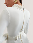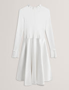 Add some vintage-inspired glamour in the ZADI dress. Featuring a fitted knitted top with ruffle collar and cuffs that gives way to a 1950s-esque full circle skirt. Pair with some classic heels for truly elegant evening look worthy of any starlet.