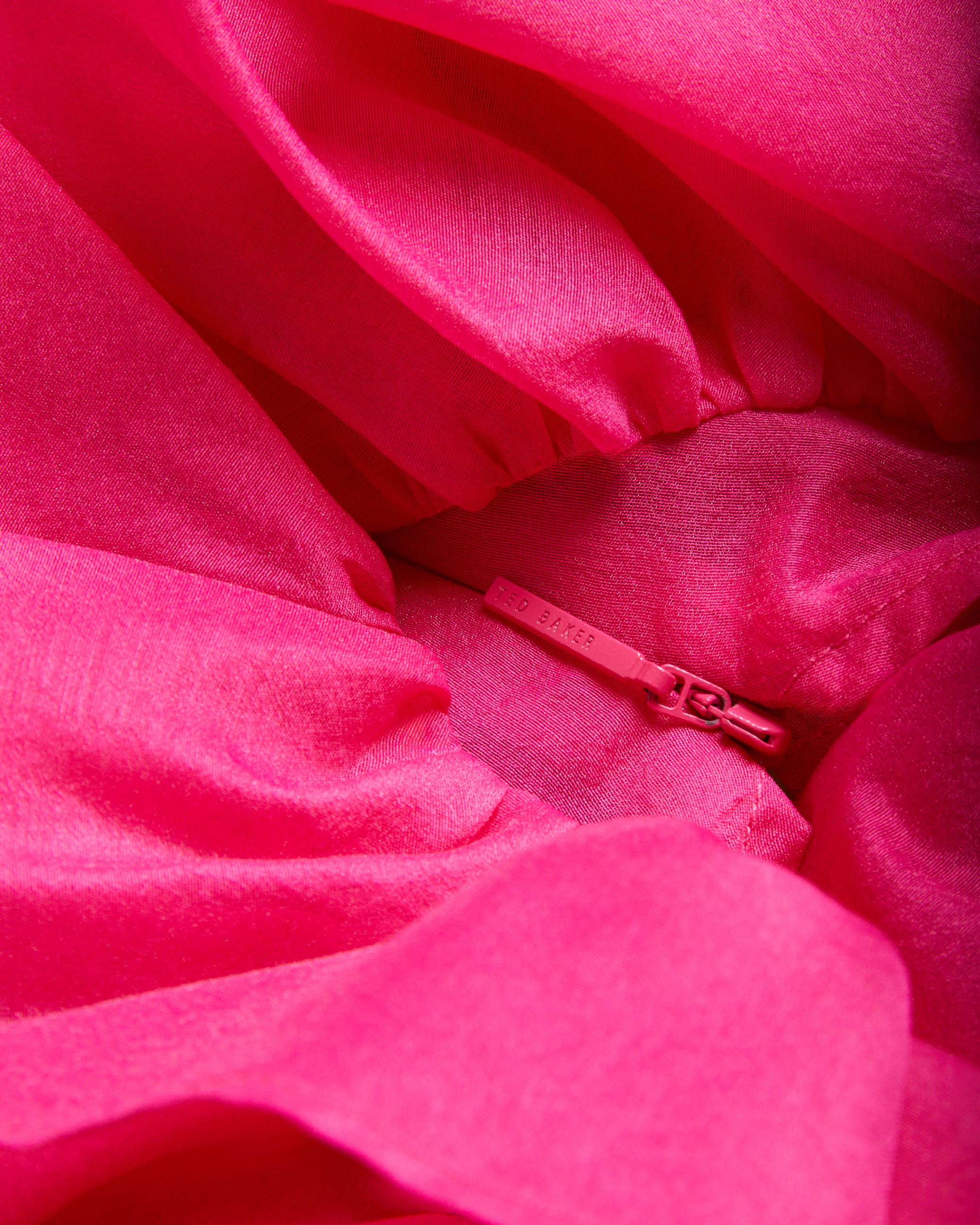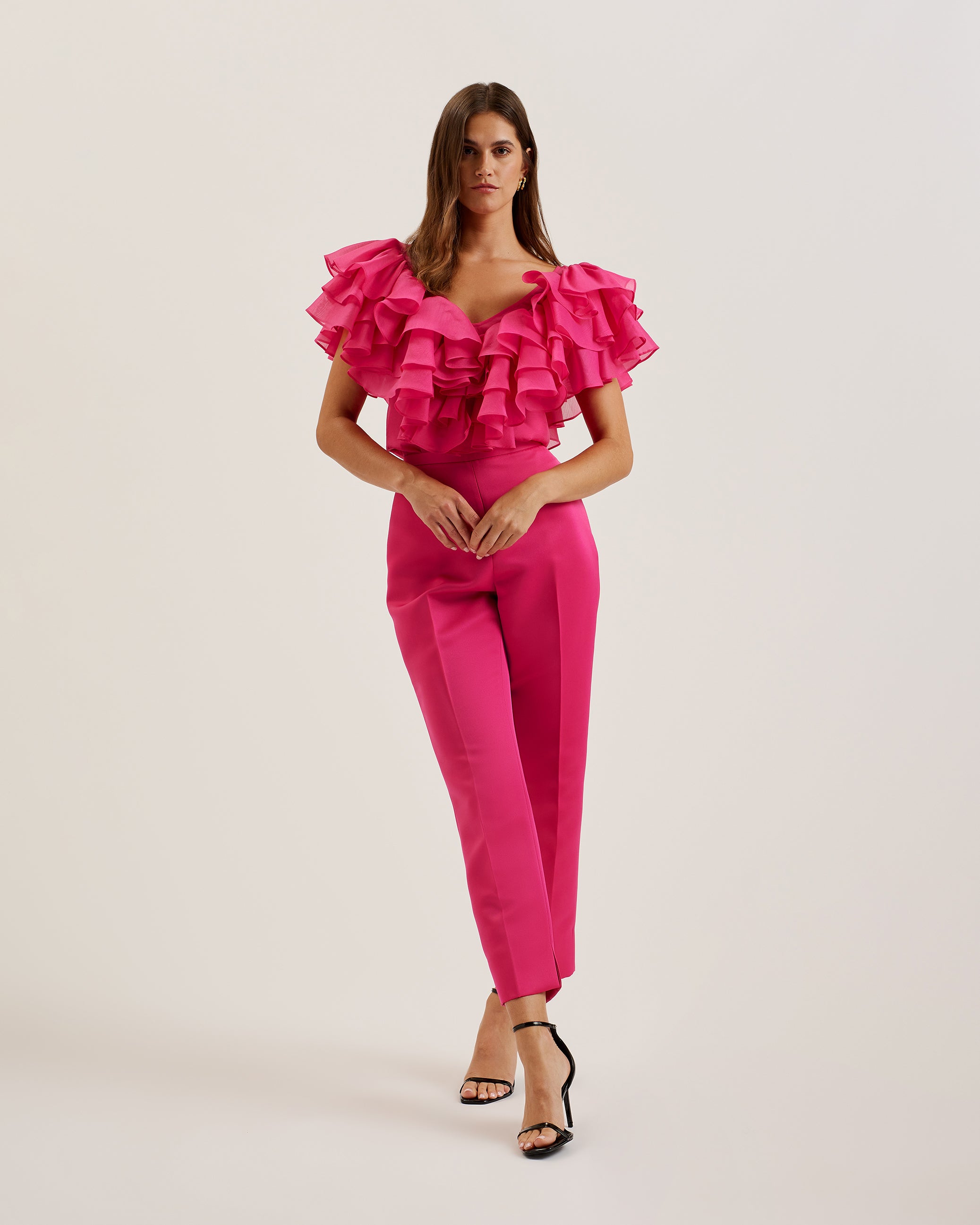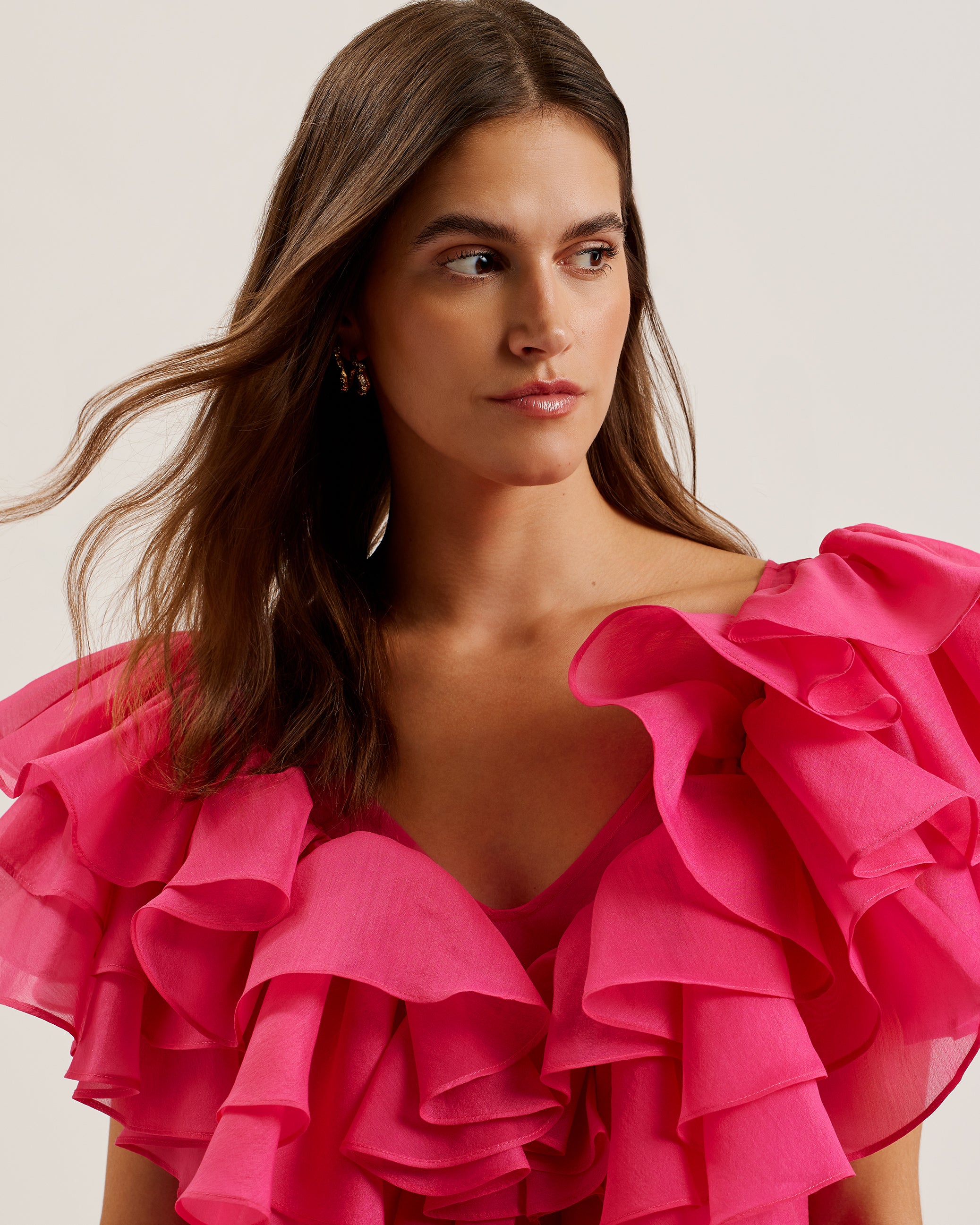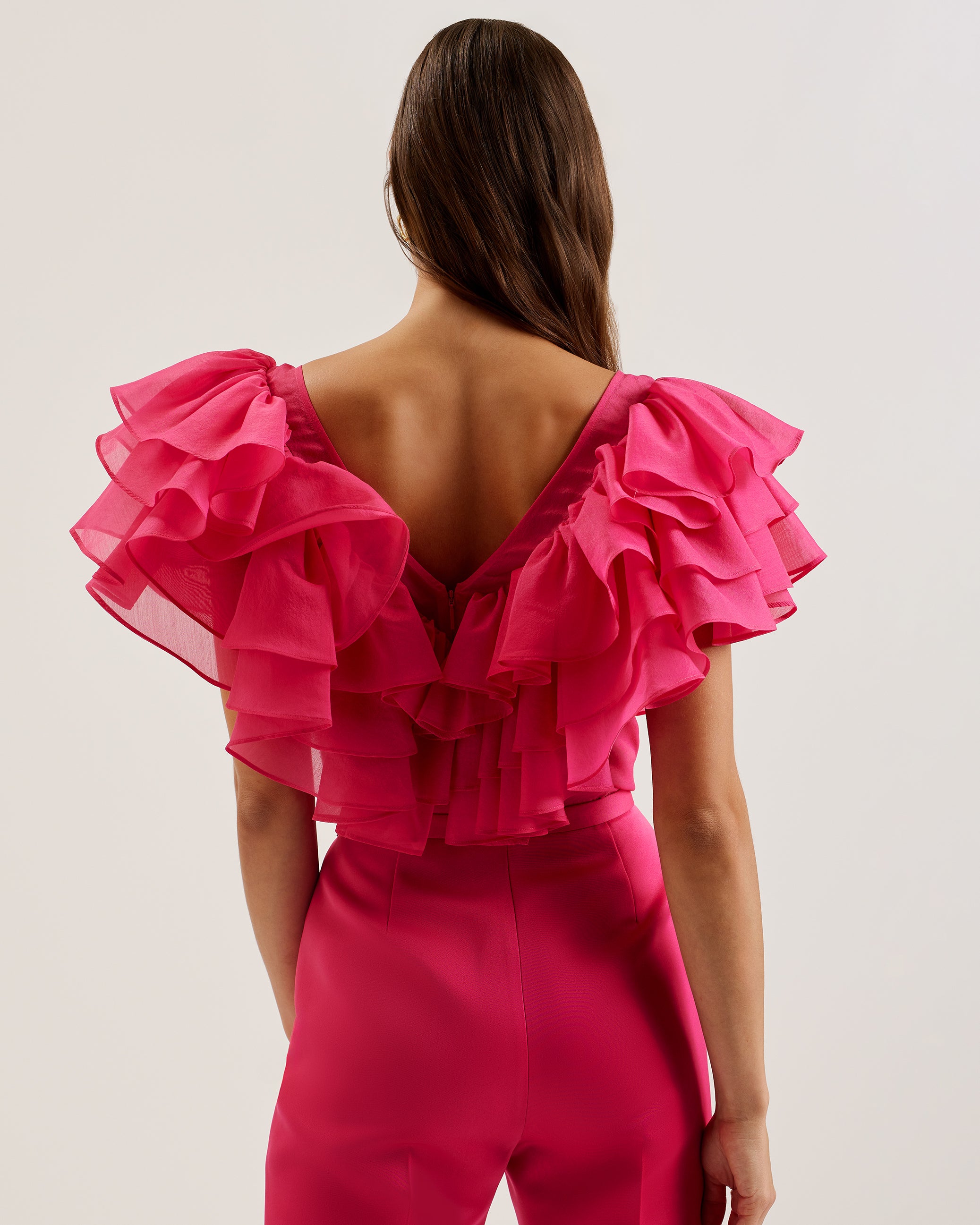 Featuring an oversized layered frill trim and graceful angel sleeves, it drapes beautifully in a straight silhouette. The flattering V-neckline adds a touch of sophistication, while the lightweight woven fabric ensures comfort. Finished with a concealed zip fastening for a seamless look.