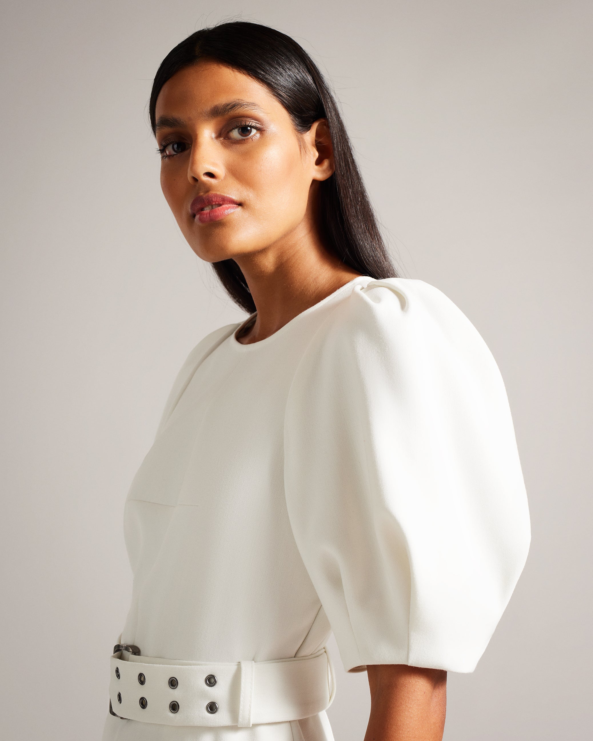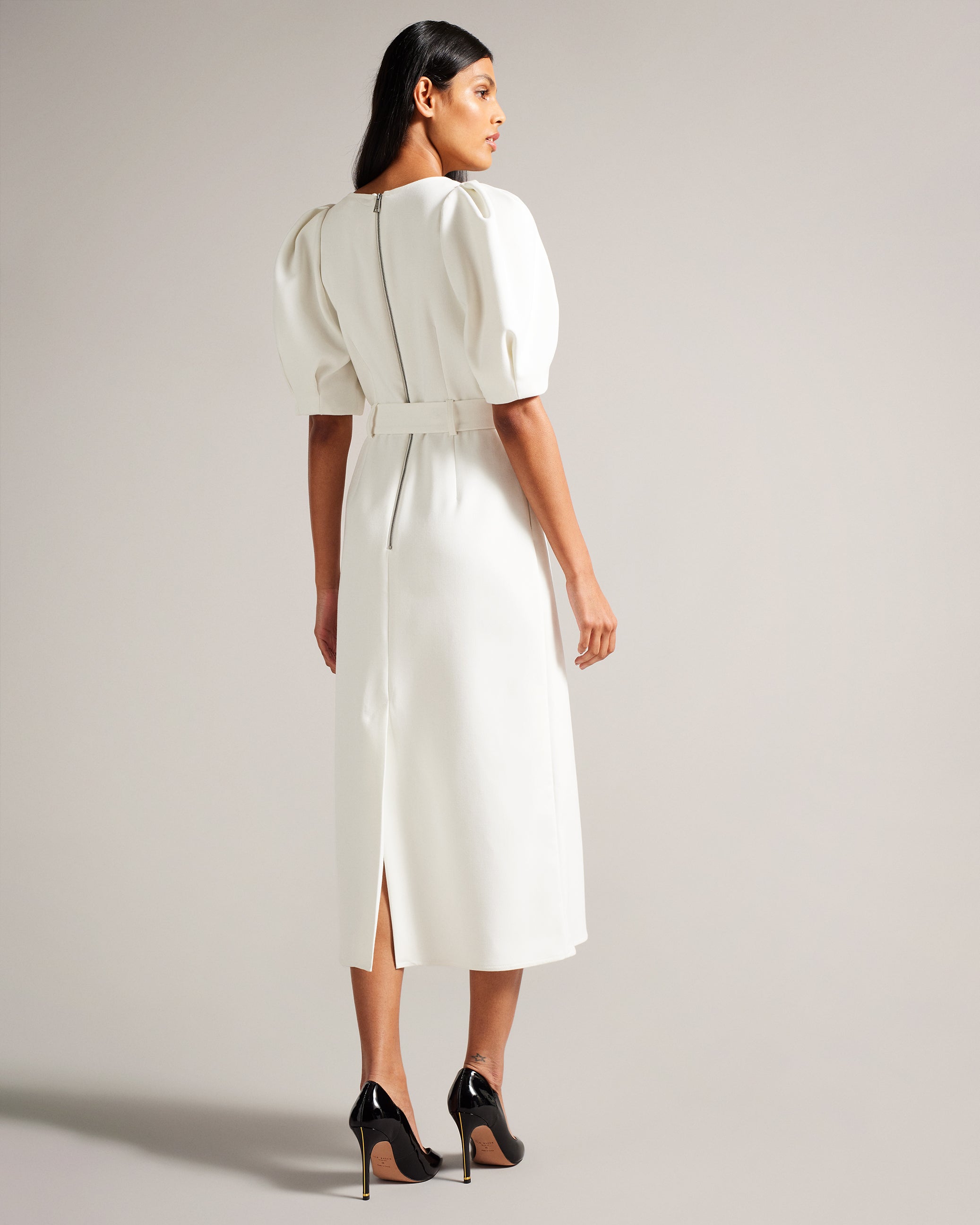The GABYELA midi dress is all about elegance and sophistication. With a refined straight fit, it boasts short puff sleeves and a graceful crew neck. A belted waist with a logo-engraved buckle enhances the silhouette.