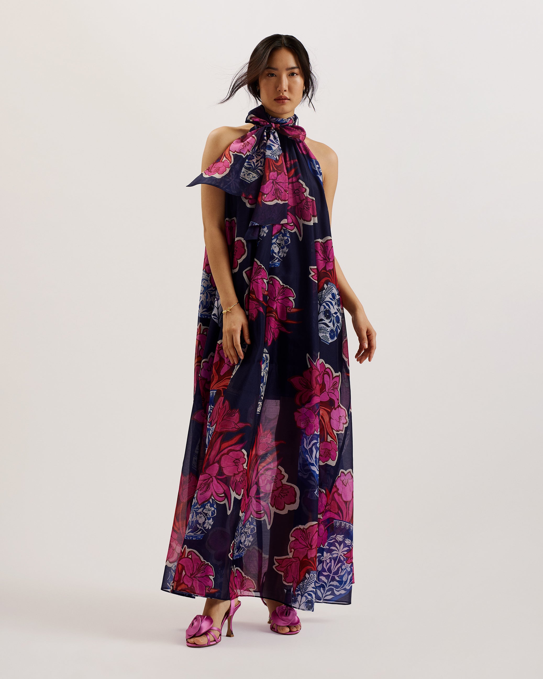 - Regular fit, tie neck, sleeveless, flared hem, all-over floral print, semi-sheer finish