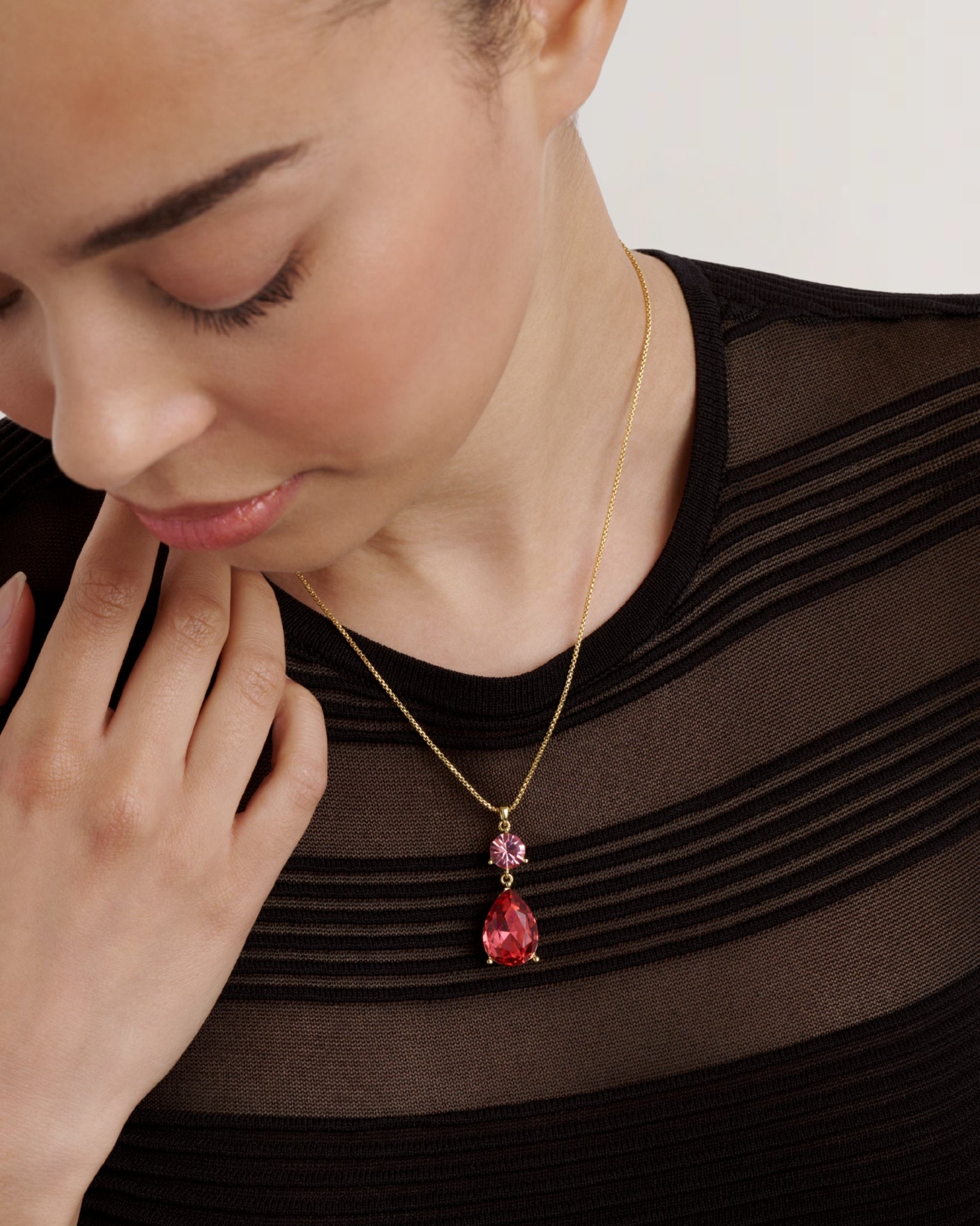 Ted Baker's Tearsa Crystal Teardrop Pendant Necklace adds the perfect finishing touch to any outfit. Featuring two fine European crystals in beautifully contrasting shades of pink, elegantly suspended from a delicate gold-tone chain. This necklace comes with an adjustable clasp for the perfect fit and comes packaged in a Ted Baker branded gift box.