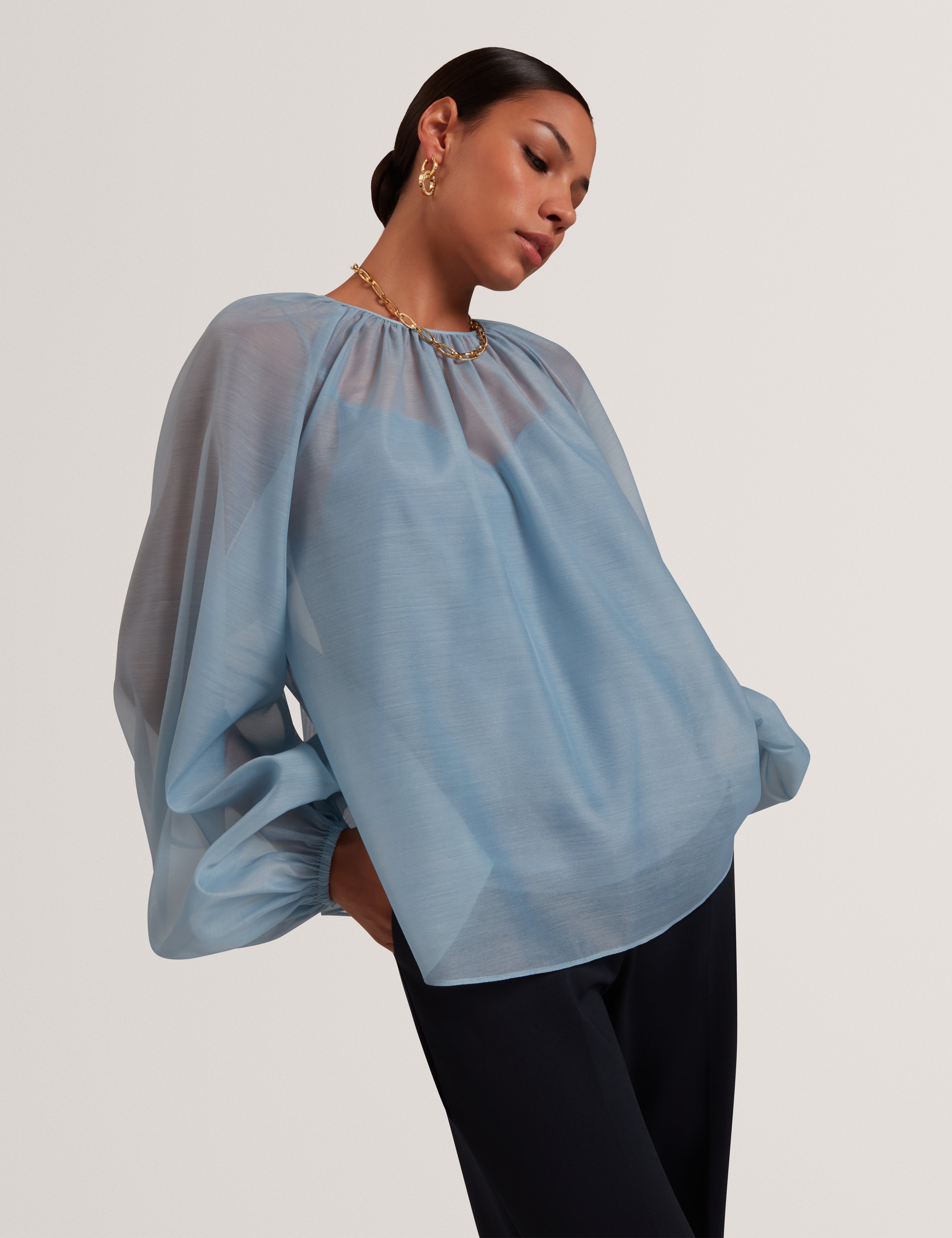 Elegant and feminine, the Ted Baker Eelana Blouse features delicate organza fabric and stylish puff sleeves for a modern, sophisticated look. Perfect for dressing up casual outfits or adding a polished touch to smart-casual ensembles.