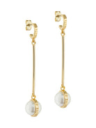 For a subtle but stellar style, the Ted Baker Perllie Logo Pearl Long Drop Earrings. A small faux pearl secured in a thin metal band, attached to a sleek metal bar, finished with gold-tone plating. Featuring stud backs for a secure fit and packaged in an elegant Ted Baker branded gift box with matching items available.