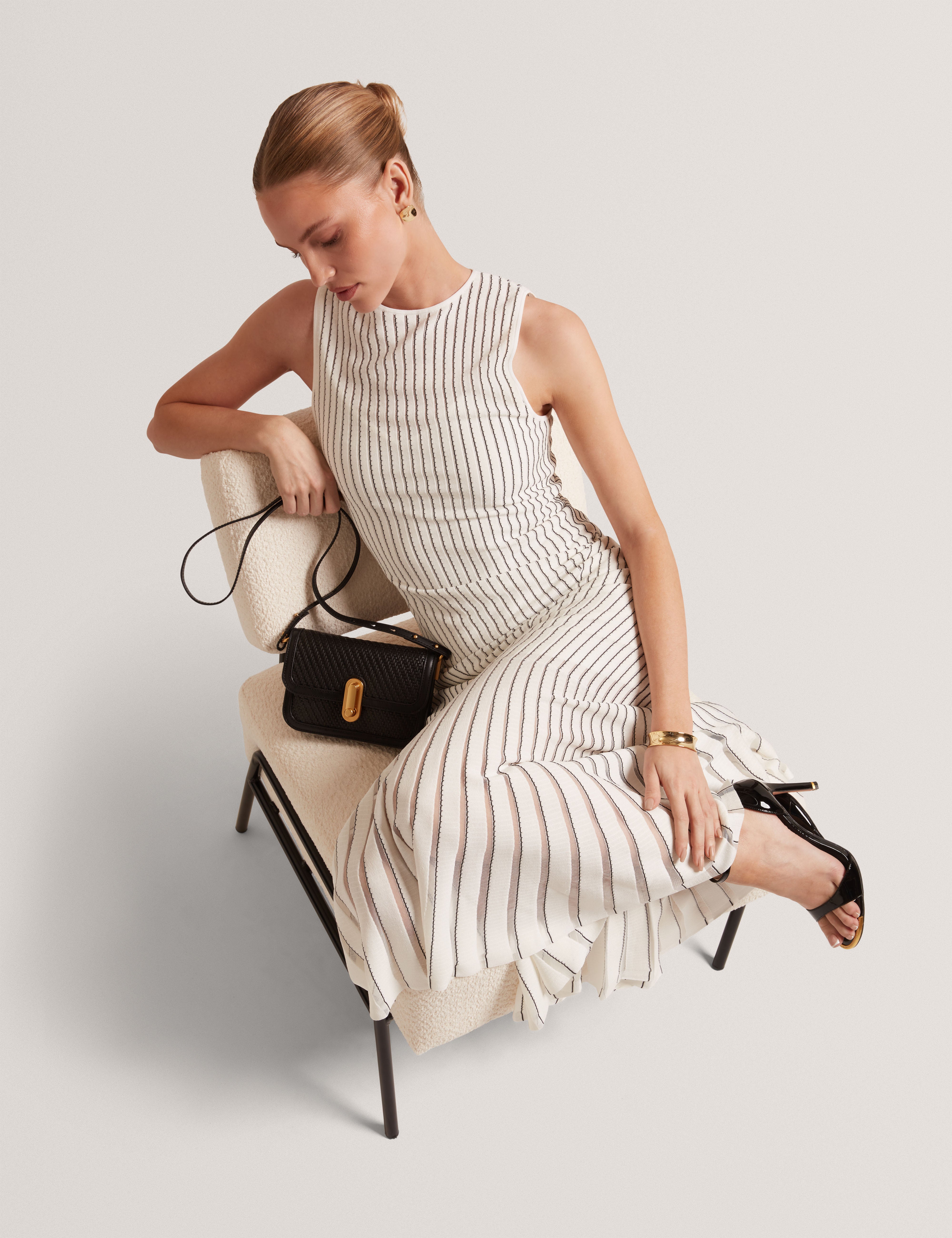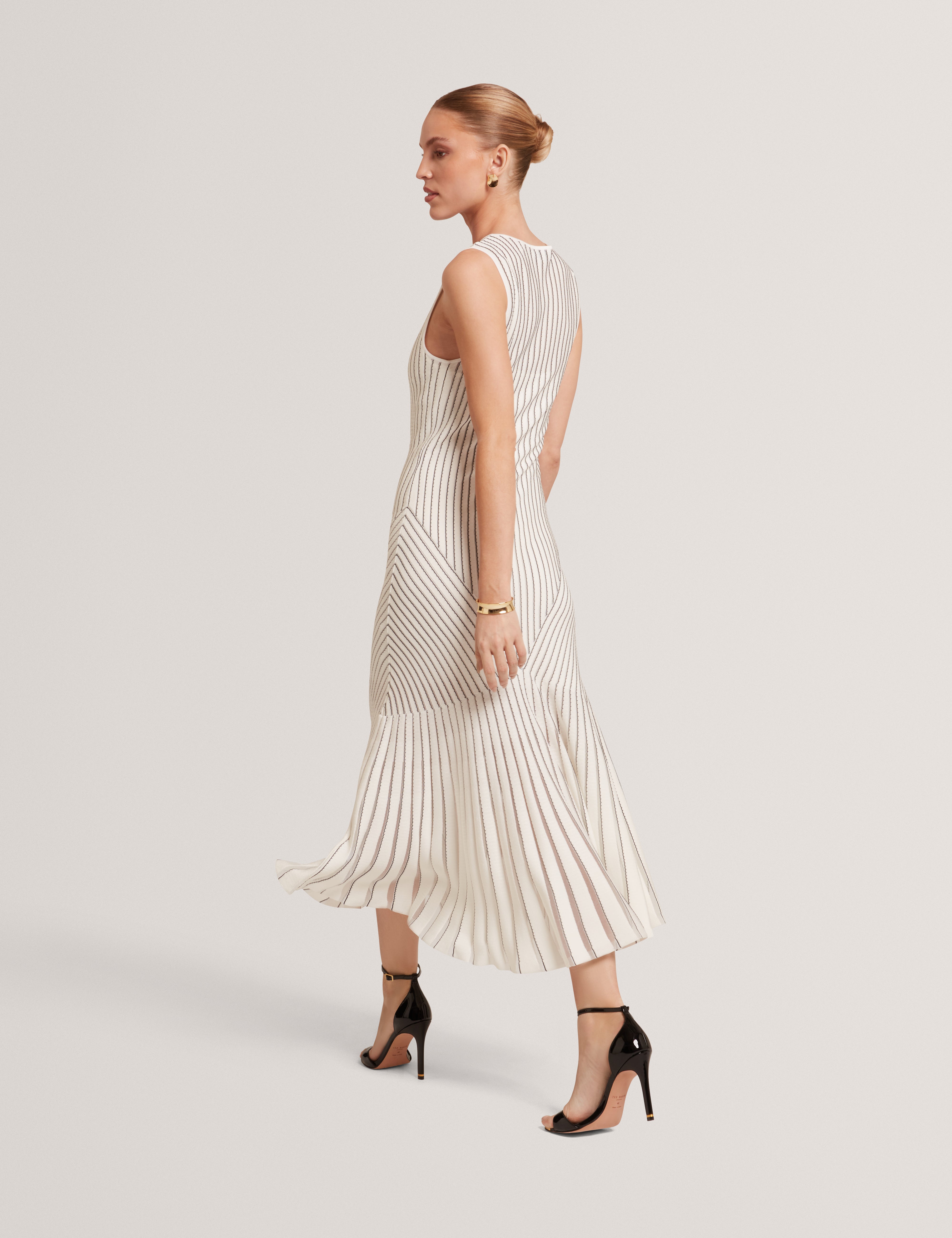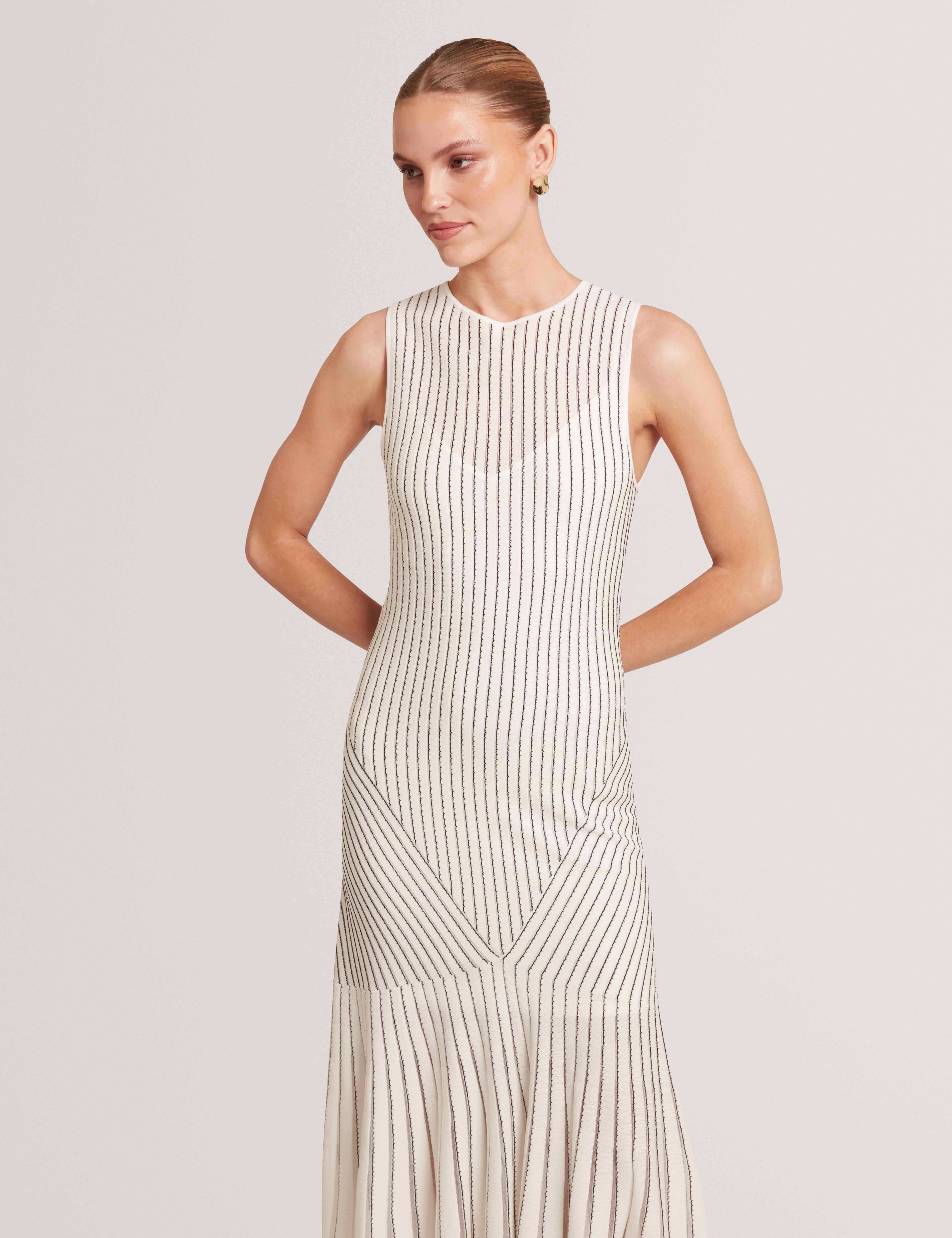Featuring stitch detailing and a striking geometric panel design, the CASANDR midi dress offers a sleek sleeveless silhouette. Modern, sculpting, and effortlessly chic, perfect for summer evenings and brunch dates with the girls