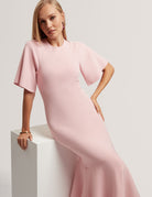A sleek knit midi dress with short sleeves, offering effortless elegance and comfort.