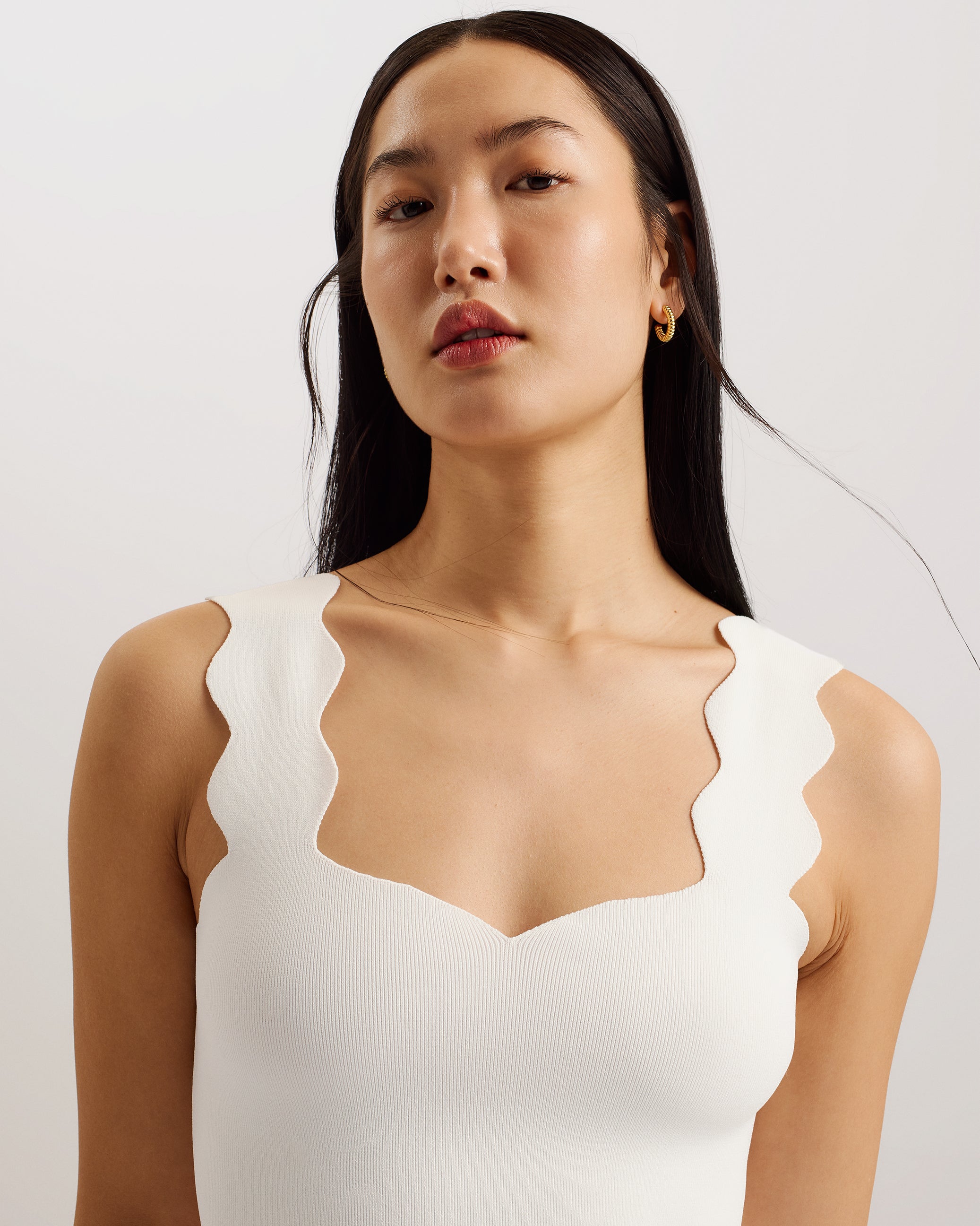 The best accessory for this dress is your curves. SHARMAY comes in a flattering midi length with a ribbed knit material that will hug your shape to create that dream silhoutte. We've added scallop detail straps and a heart neckline to bring a flirty finish to this elegant garment.