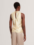 This sleeveless drape neck top features a striking print and relaxed fit, perfect for warm days or layering under jackets. Its modern design adds a touch of sophistication to casual looks.